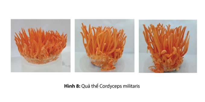4. Giai đoạn thu quả thể: sau khi quả thể được hình thành,tiến hành nuôi ở 22-23 độ C, độ ẩm < 90 %, thời gian sáng tối 12/10h ngày duy trì như thế trong vòng 50 -60 ngày là thu quả thể. Trong thời đó chiều dài quả thể đạt từ 5-7cm, có dạng đỉnh nhọn thẳng và có màu vàng cam.